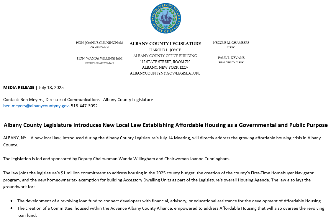 NOTICE: Albany County Legislature Introduces New Local Law Establishing Affordable Housing as a Governmental and Public Purpose