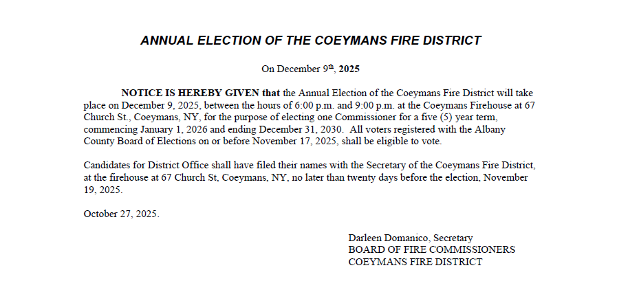 PUBLIC NOTICE: Coeymans Fire District Elections